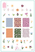 Let your nails blossom with this cheerful and charming layered stamping plate! Packed with playful petals, blooming tulips, daisies, and leafy accents, this plate brings a garden of cuteness right to your fingertips. Featuring both full-coverage floral patterns and adorable cartoon-style blossoms, it's perfect for creating sweet, spring-inspired looks or adding a pop of flower power any time of year.