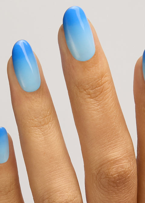 Transform your nails with Indulge — our blue colour-changing gel polish that's totally '90s! This innovative nail polish provides two shades in one, creating a stunning ombré effect that's like a mood ring for your nails.