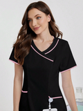 Designed for healthcare professionals and Medispa techs, this women's V-neck nursing top combines functionality with comfort. Features a practical pocket for essentials and a relaxed fit suitable for long shifts. The short sleeves offer breathability in clinical environments, while the versatile design works seamlessly as part of a complete scrub set. Available in extended sizing to accommodate all body types. An essential addition to any professional healthcare wardrobe.