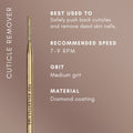 Our slim cylindrical diamond bit safely pushes back cuticles whilst removing dead skin cells from the nail plate. This precision bit helps speed up cuticle removal in place of using a cuticle pusher. Use as step 1 of cuticle prep ahead of the Cuticle Lifter Bit.