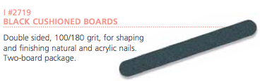 Ultra 2 Black Cushioned Boards 2719U are a nail care staple. These double-sided files feature a cushioned foam core for flexibility with a coarse grit on one side and a medium grit on the other. Excellent for natural nails, artificial nails and toenails, the cushioned boards are long-lasting and make quick work of shortening nails and smoothing the edges. A real bargain in this two-board package.