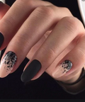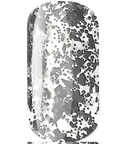 A very unique, lace like finish created with random pieces of black, embedded in a clear, soak off base.