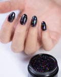 A black glitter base with tiny flashes of orange throughout, also mixed with tiny pieces of fuchsia, greens and bright blues.
