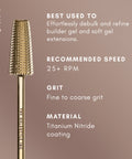 This bit is the perfect option for BIAB™ infills. Use at a higher speed to debulk the product, or at a lower speed for refining.