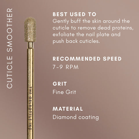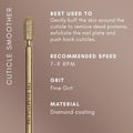 Our Cuticle Smoother and it's ergonomic design gently buffs the skin around the cuticle to remove dead proteins, exfoliate the nail plate and can support in preparing the cuticles. This final step to your cuticle prep can leave the skin polished and ready for nail plate preparation.
